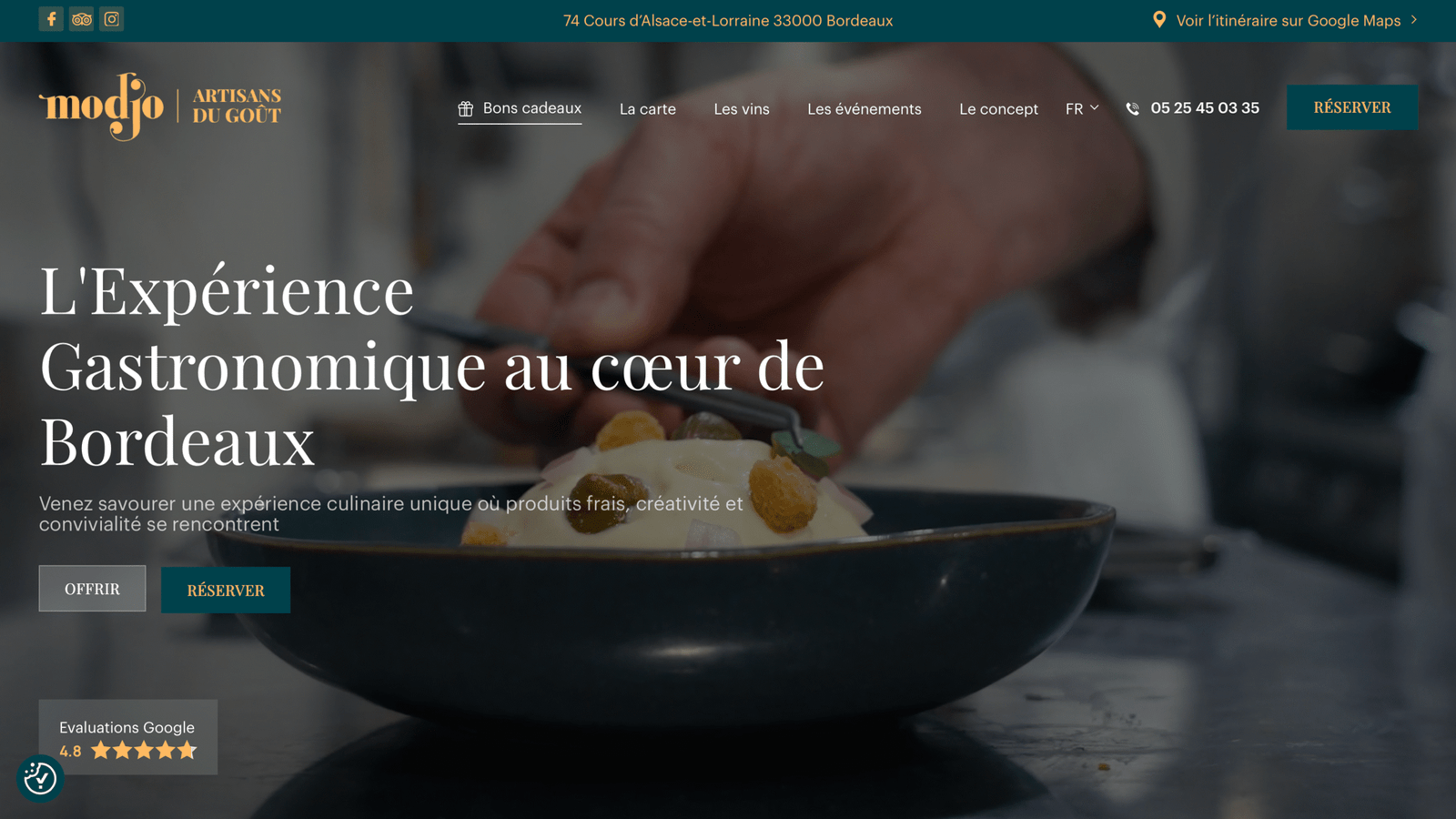 SEO local optimisé : référencement sur des mots-clés comme “restaurant gastronomique Bordeaux”, “menu blind tasting Bordeaux”, “dîner gastronomique Bordeaux centre”.